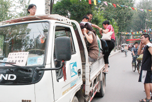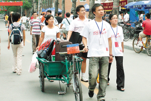 天津大學“新生報到處”所在的教學樓門前,整整齊齊地停著一排面包車、小貨車,每輛車上都貼著“迎接新生專用車”等標志。新生登記后,高年級志愿者就會幫他們將隨身行李裝上汽車。能容納五六個人的面包車塞下行李之后,載上新生一家三口,一般就再也擠不下人了。從老師們口中得知,僅僅昨天上午,他們就在兩地往返了二三十次。