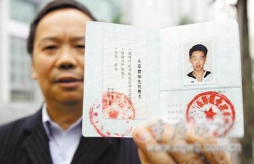 王輝的外公拿著學(xué)生證,證明他是在校學(xué)生記者 楊帆 攝