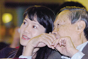 應華英文教基金會之邀,享譽世界的著名物理學家、諾貝爾獎獲得者楊振寧博士昨日(10月27日,下同)攜少妻翁帆走進東大。這回楊振寧說起了物理學的誘惑,談起中國人與諾貝爾,甚至為老朋友吳健雄叫屈,卻避口不談“翁帆和我”。然而,86歲的老先生講到盡興處還是說漏了嘴:我24小時保持思考,有時睡到12點忽然像孩子似的對翁帆說我想出來了。
