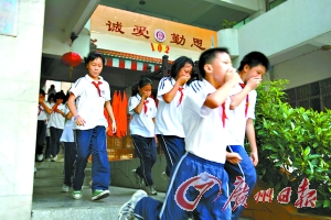 為了避免學生疏散時出現(xiàn)秩序混亂的現(xiàn)象,學校還規(guī)定,一旦真正出現(xiàn)火災或者其他危險情況,正在上課的老師需臨時充當帶班老師組織疏散,而在辦公室的老師則全部要到各個樓梯口負責維持秩序。