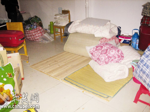 記者程翔報(bào)道:昨晚,湖北經(jīng)濟(jì)學(xué)院眾多學(xué)生因無(wú)床可睡,只好打地鋪度過(guò)漫漫寒夜!澳憧,這就是我們的寢室,床都被拆走了!弊蛲7時(shí)30分許,一名女學(xué)生指著一片狼藉的宿舍對(duì)記者如是說(shuō)(如上圖)。據(jù)她介紹,宿舍住的是該校會(huì)計(jì)學(xué)院自考班大二的學(xué)生。大一的時(shí)候,她們住在東湖邊的濱湖校區(qū)。今年9月,學(xué)校下發(fā)通知,稱已在該校大門對(duì)面商業(yè)街旁修好了幾棟宿舍,讓她們搬過(guò)去。