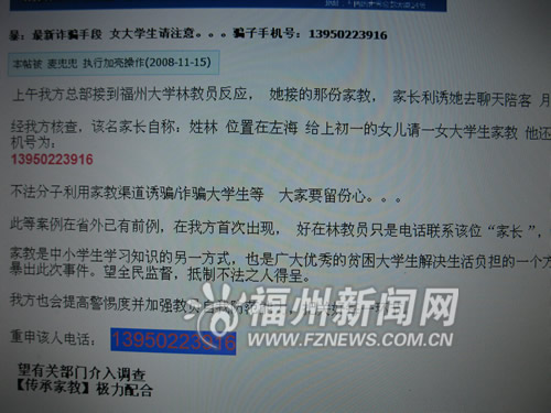 吳同學將情況反映給師大傳承家教中心。15日傍晚,在福州便民論壇,一則標題加亮的帖子《最新詐騙手段,女大學生請注意,騙子手機號……》發(fā)布。帖子寫著:“上午我方接到福州大學教員反映,她接的家教,家長利誘她去聊天陪客,月薪上千。經(jīng)核查,該家長自稱姓林,家住左海附近,給上初一的女兒請一名女大學生當家教。他還特意強調(diào)要家庭貧困的女大學生,該家長手機號為139xxxxxxx6”。該帖子也寫明了他們之所以曝光該家長手機號碼的原因:“我們不想讓女生被不法之徒玷污!