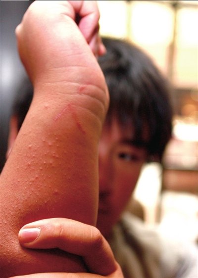 楊女士說,當(dāng)天晚上她帶孩子到醫(yī)院做了檢查。記者看到病歷本上寫著“頭部、肩膀、手臂被打傷(電棍),全身多處軟組織挫傷!庇浾呖吹剑★w的手臂、手腕處都有明顯疤痕,小飛說,這些都是被小磊用電擊器擊傷的。