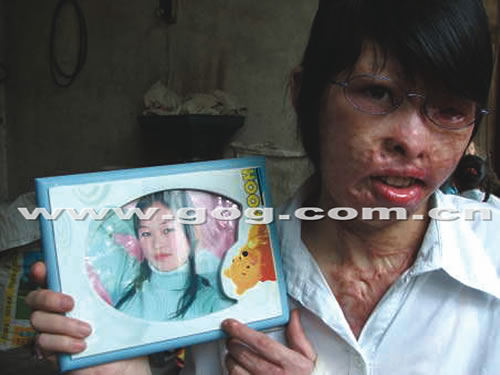 已容顏盡毀的秀娟拿著昔日長(zhǎng)發(fā)飄逸、充滿(mǎn)青春活力的照片,噙著淚水向記者訴說(shuō)了自己的不幸。
