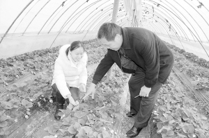 上圖:樊盛林(左)在草莓棚內查看草莓生長情況。萬建輝 攝