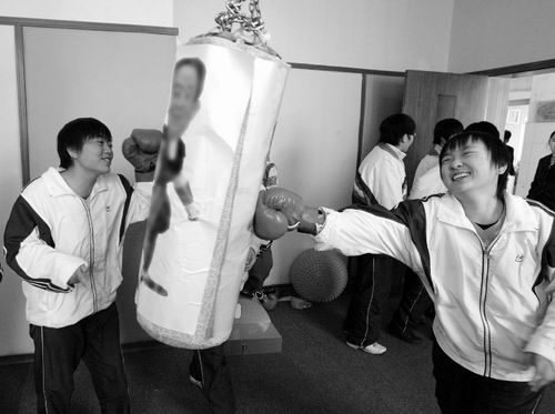 25日,記者走進(jìn)陽光心靈驛站,黃色和藍(lán)色相間的墻面讓這個(gè)房間顯得格調(diào)平和而優(yōu)雅。驛站由陽光工作室、心理宣泄室、心理放松室三部分組成。站內(nèi)還提供了諸如宣泄皮人、臉譜、放松球、沙袋及拳擊手套等宣泄工具,配備專業(yè)教師7名。記者注意到,該校分管學(xué)生的副校長孟凡祥和3位級部主任的頭像也上了沙袋,學(xué)生們打起來毫不手軟。