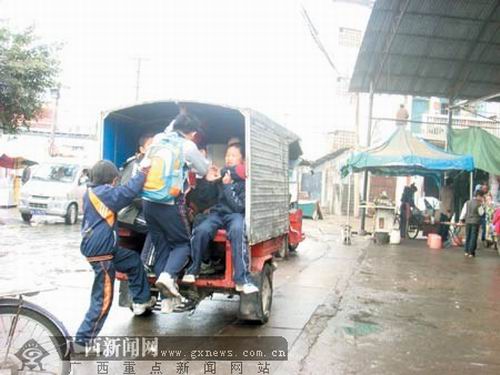 當(dāng)天霧氣很重,還下著小雨,路面潮濕。在五一西路學(xué)校門口不遠(yuǎn)的路上,一輛輛三輪摩托車雜亂的停在那里。一些看起來稍大的小學(xué)生一邊吃著手上的零食一邊往車上爬,上車之后從兜里掏出5毛錢遞給三輪摩托車手。記者發(fā)現(xiàn),那些三輪摩托車大多沒有牌照,一律的鋁皮車篷。有的已經(jīng)顯得比較破舊,連前輪的擋泥板都用鐵線綁住。而駕駛那些三輪摩托車的有男有女,有老有少,其中一輛三輪摩托車的車手看上去也就十五六歲。記者看到,其中一輛三輪車上了10多名小學(xué)生,還有一兩個(gè)要往上擠,但車上已經(jīng)沒有了空間,這兩個(gè)學(xué)生居然站在門口,雙手抓著車篷頂部,半個(gè)身體還露在外面。