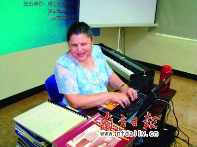 前日,在云浮市區(qū)的唯特教育培訓中心,凱文老師時而在盲人電腦上敲著英語單詞,時而站起來向學生提問。她還一邊彈電子琴,一邊教學生唱英文歌(見圖)。