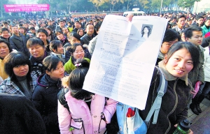 國(guó)家公務(wù)員考試昨天在全國(guó)31個(gè)考區(qū)的38個(gè)城市同時(shí)進(jìn)行。據(jù)介紹,今年報(bào)名人數(shù)創(chuàng)紀(jì)錄地超過(guò)了105萬(wàn)人,通過(guò)認(rèn)證的考生約為77.5萬(wàn)人,較上年增加 13萬(wàn)余人,是近年來(lái)競(jìng)爭(zhēng)最為激烈的一次公務(wù)員考試。與招錄的1.35萬(wàn)個(gè)職位相比,今年的考錄比約為57:1,高于去年的46:1。最搶手的職位競(jìng)爭(zhēng)率首次超過(guò)4000:1,有20多個(gè)崗位的競(jìng)爭(zhēng)比例均超過(guò)1000:1。