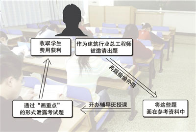 在正常教授輔導(dǎo)內(nèi)容后,輔導(dǎo)班還會(huì)有一堂特殊的課程,那就是所謂的“畫重點(diǎn)”。宋、宗兩人將已知的試題內(nèi)容作為串講的“重點(diǎn)”透露給考生,并會(huì)提醒考生“要對(duì)這些內(nèi)容特別注意”。很多“聰明”的考生花錢上輔導(dǎo)班,主要就是為了這堂課的內(nèi)容而來的。