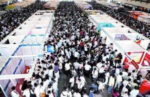 據(jù)介紹,此次共吸引了600多家用人單位參展,提供了5000余個(gè)職位,主要涉及工程技術(shù)、電子、銷(xiāo)售、人力資源以及制造業(yè)等。其中,不乏中國(guó)人壽、百盛、北大青鳥(niǎo)、聯(lián)想、百度、大中等知名企業(yè)。在舉行招聘會(huì)的國(guó)展2、3、4號(hào)館里,應(yīng)聘者人頭攢動(dòng),水泄不通,主辦方為了保證三個(gè)展館內(nèi)的正常運(yùn)行還進(jìn)行了暫時(shí)的人流控制和疏導(dǎo)。截至昨天11時(shí),招聘會(huì)已吸引了近2萬(wàn)名求職者。