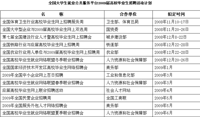中新網(wǎng)10月28日電 2008年11月至2009年6月期間,全國大學(xué)生就業(yè)公共服務(wù)立體化平臺(新職業(yè))<>將組織舉辦13場專場網(wǎng)絡(luò)招聘會。