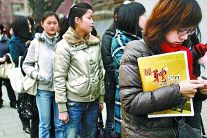 本報訊 今天上午9時,2009年女大學生專場招聘會在位于德勝門的北京畢業(yè)生就業(yè)市場舉行。離招聘會開始還有半小時,門前卻已蜿蜒排起了幾百米的長隊。截止記者發(fā)稿時,應聘學生已突破了四千人。