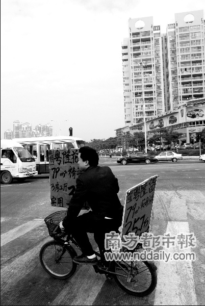 他不是收購(gòu)廢舊家電,而是推銷房子。昨天中午,在珠海香洲區(qū)梅花路三叉路口附近,出現(xiàn)了一個(gè)特別的房屋經(jīng)紀(jì)人:穿西裝,沒(méi)打領(lǐng)帶,騎一輛半舊女式自行車,車前后各固定一塊大紅紙板,寫(xiě)著他認(rèn)為“最吸引”的二手房源信息。