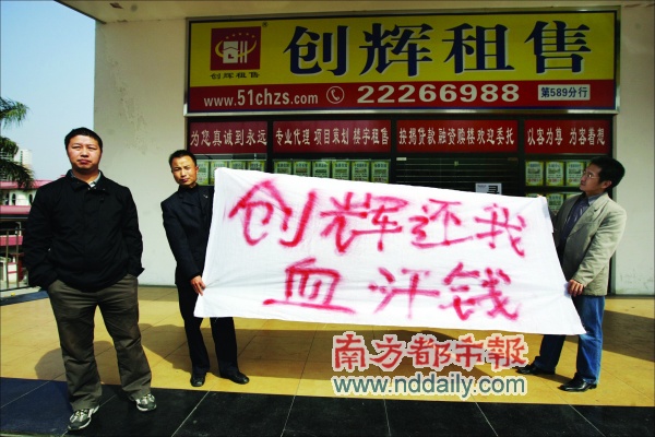 近20位客戶聞訊趕到創(chuàng)輝租售水云軒中山總店追討欠款。店員的統(tǒng)一答復(fù)是“追討欠款的業(yè)主請到深圳總部查詢”。該公司一名陳姓置業(yè)顧問表示,“我們最多虧一個(gè)月的工資,還承受得了。最慘的是客戶,有的人怕是一輩子攢下的錢都難指望了!