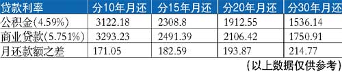 以貸款30萬元為例,采取等額本息還款法,采用公積金貸款和商業(yè)貸款,其月還款額對(duì)比為:(單位:元)