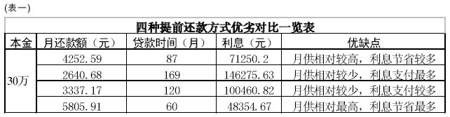 方式一,部分提前還款,剩余的貸款保持每月還款額不變,將還款期限縮短。如此算來,30萬元貸款需照舊每月還款4252.59元,需要大概七年零三個月左右的時間。利息共計71250.20元。