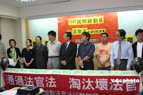 臺灣“民間推動法官法行動聯盟”十月二十五日召開記者會宣布,將于十月二十七日在臺北中正紀念堂前廣場發(fā)動“我要法官法”大游行。組織者說,很多人進法院是要追求公平正義,但卻因不良的法官,受到再次傷害,法官法法案中最重要的就是法官的淘汰機制。在臺灣, 法官法已推動十幾年,至今尚未通過。中新社發(fā) 耿軍 攝