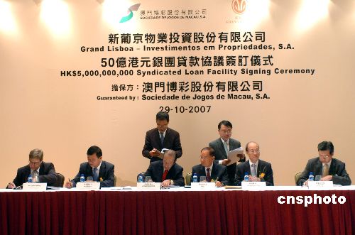 十月二十九日,新葡京物業(yè)投資股份有限公司在澳門新葡京成功,簽訂五十億港元銀團貸款協(xié)議。是項貸款由誠興銀行、中國工商銀行澳門分行以及法國巴黎銀行香港分行牽頭協(xié)調,中國農業(yè)銀行香港分行等十家銀行參與。是項銀團貸款分五年期,由澳門博彩股份有限公司擔保,貸款將用于新葡京項目。澳門博彩股份有限公司行政總裁何鴻燊博士出席簽字儀式。中新社發(fā) 史利 攝