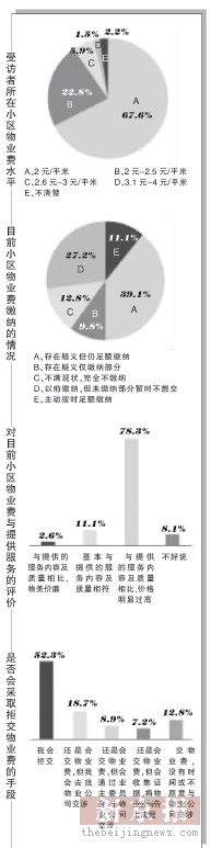 問卷顯示,豐臺區(qū)三環(huán)新城、昌平區(qū)天通苑、龍澤苑、朝陽區(qū)國美第一城均有業(yè)主大范圍拖欠物業(yè)費的現(xiàn)象和相當(dāng)一部分業(yè)主拒交物業(yè)費的現(xiàn)象。