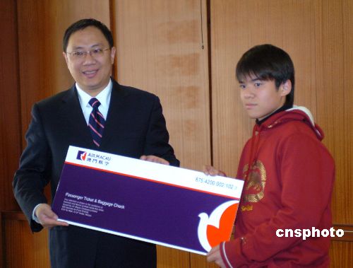 一月二日,澳門航空運營總裁陳新先生(左)在總部為澳門航空與澳門電訊聯(lián)合在澳門-大阪航線上舉辦的一項推廣活動獲獎?wù)哳C獎。中新社發(fā) 史利 攝