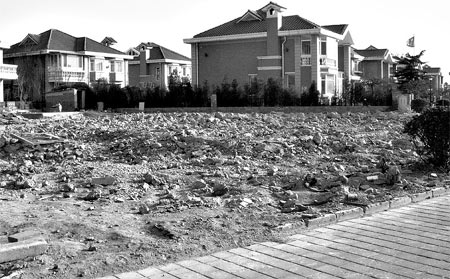 一片瓦礫、紅磚碎片,角落里并肩躺著4個(gè)抽水馬桶,旁邊堆著200多塊路牙石,曾經(jīng)小區(qū)里惟一聯(lián)排的別墅蕩然無(wú)存,與周圍紅墻藍(lán)瓦的整體風(fēng)貌格格不入。2月22日,記者獲準(zhǔn)在北京國(guó)際花園看到的這片廢墟,“造價(jià)”超過(guò)千萬(wàn)。