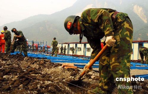 六月三日,空降兵士兵在四川什邡為受災(zāi)群眾建造臨時(shí)板房。這支空降兵部隊(duì)是一支有輝煌戰(zhàn)史的英雄部隊(duì),在五月十二日大地震發(fā)生后八小時(shí)即空降至當(dāng)?shù)。目前抗震救?zāi)工作已進(jìn)入重建家園階段,他們共幫助受災(zāi)民眾建設(shè)六千多平方米的板房,搭建帳篷四千多頂,同時(shí)幫助恢復(fù)生產(chǎn)。中新社發(fā) 慎重 攝