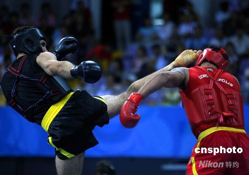 8月23日下午,在北京2008武術(shù)比賽男子散手70公斤級(jí)較量中,伊朗選手侯賽因·奧賈吉(黑方)戰(zhàn)勝巴西選手埃默松·諾蓋拉·阿爾梅達(dá)(紅方)。中新社發(fā) 宋吉河 攝
