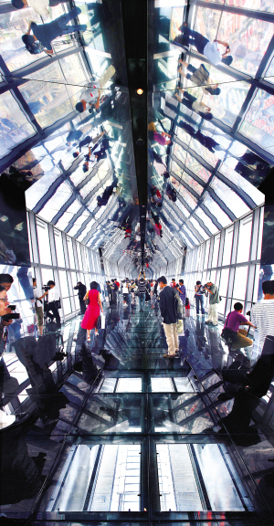 再轉(zhuǎn)乘專用電梯,終于來到位于100層、距地面474米處的“觀光天閣100”。這是目前世界最高的觀光設(shè)施。55米長的懸空觀光長廊,其實(shí)就是大廈頂部倒梯形風(fēng)洞的上檐,三角形屋頂鑲滿玻璃鏡面,光影折射夢幻迷離。長廊地面鋪有3條透明玻璃地板,可直接俯瞰腳底下陸家嘴金融貿(mào)易區(qū)川流不息的車流、芳草如茵的綠地及連綿的樓宇,對膽量是一種小小的考驗(yàn)?zāi)兀‰y怪在轉(zhuǎn)乘電梯時,顯示屏播放的內(nèi)容為:玻璃地板的安全性能。