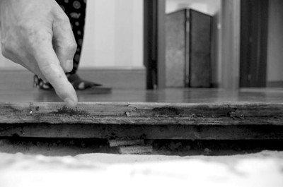 “距我們反映主衛(wèi)門框下面滲水、造成主臥的地板部分褪色、門框底框腐爛、門套底部貼面有氣泡突起、地磚大面積發(fā)黃這些問題已經一個月了。有人來看過也說是‘防水沒做好’,但沒單位負起這個責,徹底解決這件事,只是互相推諉。作為弱勢群體的我們只能不停地反映、等待,F在被挖開的地方,每天都會有小蟲爬出來。哎,花600多萬買的房子,浴缸卻只能看不能用。 ”陳老先生的老伴邊說邊指著旁邊畚箕里她掃出來的黑色小蟲子。對此,物業(yè)部門也派人檢查了好幾次。