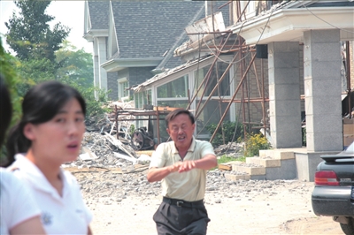 記者昨天中午在30區(qū)16棟別墅前看到,別墅周圍的綠地基本被毀,擴(kuò)建仍在繼續(xù),F(xiàn)場支著大量腳手架,堆放著很多建材,工人們正在吃午飯。這棟別墅的業(yè)主告訴記者,他的別墅屋頂采光不好,他想改成平頂。擴(kuò)建前他去規(guī)劃局報批未獲理睬,覺得“別墅內(nèi)的綠地也都是自己買的,空著還不如建成房子,還能多住些人”,他便隨后開工。