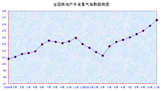 中新網(wǎng)12月17日電 國家統(tǒng)計局官方網(wǎng)站今日公布,11月份,“國房景氣指數(shù)”為106.59,比10月份上升0.85點,同比上升2.67點!皣烤皻庵笖(shù)”以100為臨界值,指數(shù)值高于100為景氣空間,低于100則為不景氣空間。10月房地產(chǎn)開發(fā)投資分類指數(shù)為104.42,比9月份上升0.35點,同比上升2.74點。