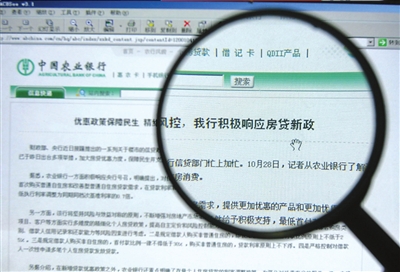 昨天下午,農(nóng)行成為本輪新政出臺(tái)后首家發(fā)布房貸細(xì)則的銀行,但在當(dāng)天晚上,農(nóng)行市場(chǎng)部卻通知記者:“該細(xì)則有些細(xì)節(jié)還要改動(dòng),監(jiān)管部門(mén)已將掛在農(nóng)行首頁(yè)上的相關(guān)文章撤下!庇浾唠S后打電話咨詢銀監(jiān)會(huì)相關(guān)負(fù)責(zé)人,該負(fù)責(zé)人表示沒(méi)有下達(dá)過(guò)指令,不清楚是什么情況。有業(yè)內(nèi)人士坦言,新政策“很難把握”,還得再看看。
