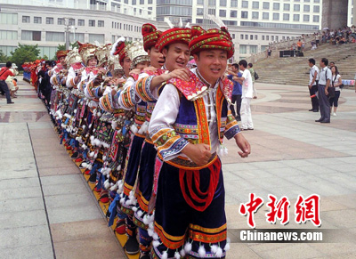 今天,由中國(guó)工藝織錦大師譚湘光和8名“織女”經(jīng)過(guò)96天織就的世界最大壯錦,在“廣西活動(dòng)周”開(kāi)幕式上贈(zèng)獻(xiàn)給上海世博會(huì),壯錦長(zhǎng)6.2米,寬3.6米。同時(shí),“世界最長(zhǎng)板鞋”亦亮相“廣西活動(dòng)周”,該板鞋共23節(jié),每節(jié)2.2米,總長(zhǎng)為50.6米,由115位身穿少數(shù)民族盛裝的青年男女腳踏板鞋喊著號(hào)子向前行走。(完)