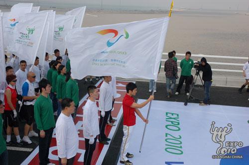 中新網10月26日電 據上海世博會官方網站消息,25日,“‘綠色世博 志愿心’中國2010年上海世博會志愿者長江大橋跑”活動,在即將通車的“長江門戶第一橋”——上海長江大橋橋面上隆重舉行。中國2010年上海世博會志愿者宣傳大使、影視明星黃曉明引領近萬名志愿者,邁著矯健的步伐,緩緩跑過大橋,傳遞著巨型的世博會志愿者旗幟,以踐行“奉獻、友愛、互助、進步”的志愿者精神,闡述“城市,讓生活更美好”的上海世博會主題。