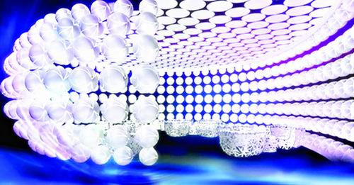幻影繡球——在展示大廳中心懸墜直徑在60—80厘米之間的幻影繡球,繡球外觀經時尚化、科技化處理,通體為透明材質,內嵌4塊顯示屏達到全角度視頻展示,通過地面投影、LED視屏與照片傳輸技術融為一體的時尚科技完成即時成像,當參觀者走過幻影繡球下時,繡球上便會映出相應影像。