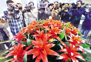 “中國紅”是鮮花港科技興市重大攻關(guān)項(xiàng)目的最新成果。這一鳳梨花新品色澤純正花型飽滿,葉片大花期長,環(huán)境適應(yīng)性強(qiáng),是較理想的室內(nèi)用花。(薛慧卿 孫中欽)