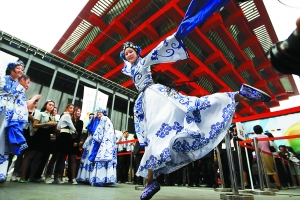 上午10時(shí),隨著“北京歡迎你”歌聲的響起,北京周慶典廣場(chǎng)第一場(chǎng)文藝演出開始。白色的天壇是背景,舞臺(tái)上紅衣少女隨著鼓點(diǎn)在舞動(dòng),鼓點(diǎn)聲從廣場(chǎng)中心向四周傳開,傳向世博軸,傳向中國(guó)館。