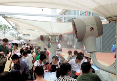 上午園區(qū)開(kāi)放后,記者看到不少游客并沒(méi)有急著參觀展館,而是在遮陽(yáng)棚下的長(zhǎng)凳上小憩、喝水、抹防曬露。而撐著遮陽(yáng)傘排隊(duì)幾乎成為“普遍規(guī)律”,太陽(yáng)鏡、遮陽(yáng)帽也成為參觀者的“標(biāo)準(zhǔn)配置”,有些游客甚至帶著濕毛巾擦汗、降溫。園區(qū)內(nèi)的公園、綠地以及多處噴霧、透水地面、遮陽(yáng)棚等場(chǎng)所、設(shè)施的降溫作用明顯,受到游客歡迎。