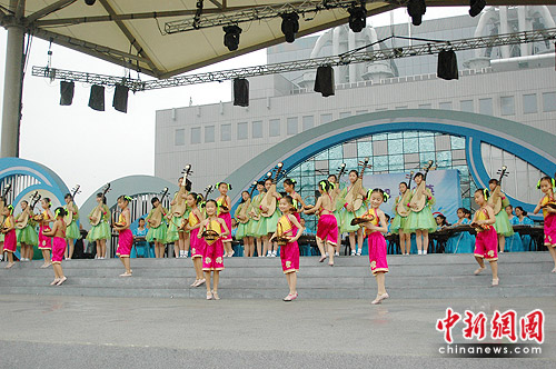 中新網(wǎng)上海6月27日電(趙龍)行云流水的古箏、歡快奔放的二胡、委婉鏗鏘的琵琶……今日伴著淅淅瀝瀝的雨聲,百余名蘇州少年帶來的“琴瑟滄浪”民樂演奏音樂會,在世博園全球城市廣場奏響,讓中外觀眾領(lǐng)略了一把中國傳統(tǒng)民樂的魅力。