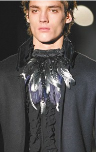 今年秋冬領(lǐng)片有短一截的趣味,斯文秀氣地輕松一掛,搭配蕾絲襯衫,在陰柔之中增加貴族氣息。象征自由意象的羽毛,秋冬出現(xiàn)的機率極高,不過最特別的算是串成頸飾,像項鏈一樣綁在頸邊,再加上珠鏈垂墜、細膩編織穿插,效果令人驚艷。