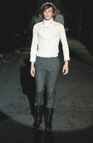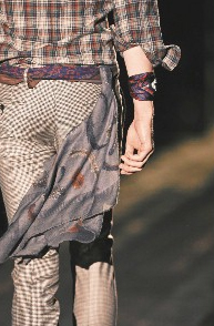要表現(xiàn)貴公子獨特風味,垂墜在前襟最為妥當,或是嘗試把絲巾系在頸邊、手腕邊,也可以試試外繞在金屬腰帶上,或干脆讓絲巾隨著步伐在腰際擺動飄逸。絲巾質(zhì)感輕柔,和秋冬大量出現(xiàn)的華麗搖滾有剛與柔、動與靜對應(yīng)的美感,更加突顯秋冬流行潮流。