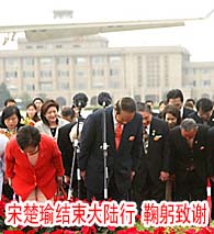 ·宋楚瑜家鄉(xiāng)先祖墓葬完好如初 祭祖儀式共分九步 ·家鄉(xiāng)湘潭市五星酒店為宋楚瑜營(yíng)造“回家”氛圍 ·宋楚瑜深夜會(huì)見(jiàn)劉銘傳后代欣然稱當(dāng)“名譽(yù)顧問(wèn)” · 選"主席"棄"總統(tǒng)" 宋楚瑜下榻酒店突出瀟湘特色 ·花絮:南京中山陵市民、游客與記者“搶”鏡頭 ·宋楚瑜攜42件琉璃贈(zèng)大陸 與連戰(zhàn)均選王俠軍作品 · 圖文:劉曼君講述宋楚瑜家族在大陸的一張全家福