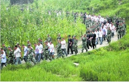 在武警官兵和監(jiān)獄民警的押送下,服刑人員按照編號每兩人戴一副手銬,徒步翻山繞行。腳下是暴雨沖壞的碎石山路,兩邊不時有高高的玉米梗和綠油油的稻田。走了半個多小時,隊伍到達(dá)了一處涵洞垮塌現(xiàn)場。狹窄的道路只容許三個人并排通過,為了防止出現(xiàn)意外,武警狙擊手提前在此持槍警戒,服刑人員們依次通過。