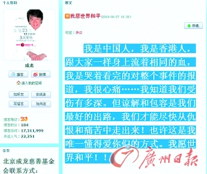 事件擾攘數(shù)天后,身在北京的成龍前晚終于打破緘默發(fā)出聲明,就自己的“詞不達(dá)意”,向全香港市民致歉。聲明內(nèi)容大意是指美國(guó)助手把他的留言翻譯得不完整,自己只是不想香港與菲律賓民眾之間互相仇恨,更強(qiáng)調(diào)自己是百分百中國(guó)人,自己也認(rèn)為必須追究菲律賓警方指揮不力的責(zé)任,更為遇難者感到悲痛,并向他們的家屬致上最深切的哀慟。