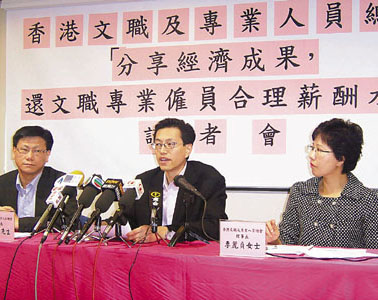 工聯(lián)會(huì)屬會(huì)香港文職及專(zhuān)業(yè)人員總會(huì)權(quán)益委員會(huì)在去年9至11月,成功訪(fǎng)問(wèn)735名會(huì)員,包括銀行、證券、保險(xiǎn)、會(huì)計(jì)、教育等從業(yè)人員,結(jié)果發(fā)現(xiàn):60%人去年獲加薪,另有分別33.3%、22.4%和21%受訪(fǎng)者說(shuō),會(huì)因“薪酬缺乏吸引力”、“同工不同酬”和“工時(shí)越來(lái)越長(zhǎng)”而考慮轉(zhuǎn)行或轉(zhuǎn)工,大多人表示會(huì)考慮投身金融界,如證券、銀行、地產(chǎn)、會(huì)計(jì)等。