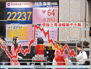 港股ADR中,跌幅最大的為國(guó)壽,其ADR折合價(jià)為26.87元,較港股周五收市跌3.1%,匯控與聯(lián)通也跌2.4%至2.45%。高信投資行政總裁沈慶洪認(rèn)為,貝爾斯登的財(cái)困情況,未必是單一例子,類同事件或會(huì)繼續(xù)爆發(fā),故18日港股將下試今年低位21709點(diǎn),其后在減息刺激下,或會(huì)稍為回穩(wěn),但本周末段時(shí)間,仍有機(jī)會(huì)再度下試21100低位后,恒指的調(diào)整才有機(jī)會(huì)喘定。
