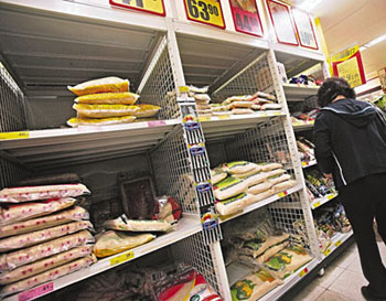 國(guó)際市場(chǎng)食用米供應(yīng)緊張和大幅加價(jià),令香港部分市民出現(xiàn)恐慌心理,紛紛到超市入貨。3月31日,一些超市的貨架上,部分牌子的泰國(guó)米已經(jīng)缺貨。有市民表示,擔(dān)心米價(jià)會(huì)再上升,所以入多點(diǎn)貨,有市民甚至用小推車一次性購(gòu)十幾包。不過,也有市民表示并不擔(dān)心,因?yàn)椤耙话卓梢猿院芫谩薄?