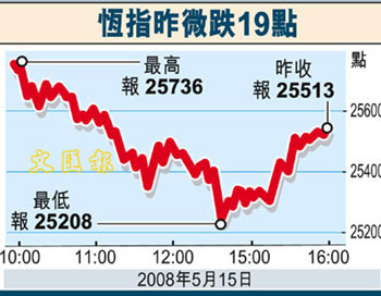 中新網(wǎng)5月16日電 據(jù)香港文匯報報道,港股15日跟隨美股高開,但其后市況轉(zhuǎn)弱,更一度倒跌超過300點,曾低見25208點,全日收報25513點,跌19點,全日上下波幅528點,成交回升至801億港元。業(yè)界料港股短期反復(fù)向上,但若有足夠資金配合,恒指短線可上試26000點。