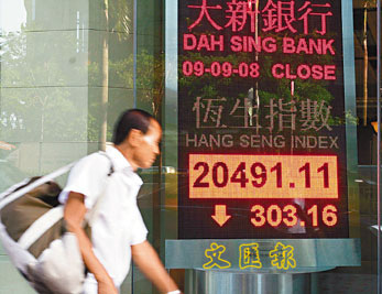 港股9日未能延續(xù)周一勁升860點(diǎn)的強(qiáng)勢,就算美股高收近300點(diǎn),恒指也跟隨亞洲區(qū)股市下跌,剛開市已跌355點(diǎn),最多跌近500點(diǎn),下午跌勢喘定,收報20491點(diǎn),跌303點(diǎn),成交額比周一大減200億元至479.5億元。